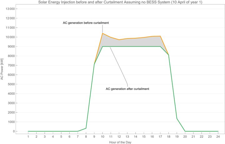 3- During the first year, the specific yield for the system Solar+BESS is equal to 3,100 MWh/MWp. That number would have been around 2,800 MWh/MWp if the system had no BESS integrated to it. The addition of the BESS makes use of 10%+ more energy since less energy would be curtailed during the day at the point of interconnection due to the system MWac limit (see graph below for example day, all the gray area is lost energy due to curtailment at 9MWac at the point of interconnection).
