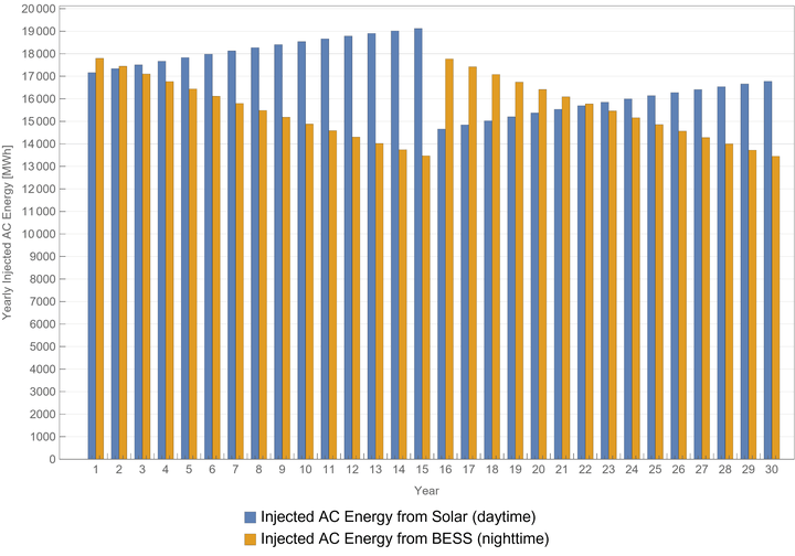 1- After year 15, we are replenishing the BESS system after it’s 15year lifetime ends; once the system reaches 70% efficiency, we will add batteries in order to upgrade the system back to its original 100% efficiency. That element is clear in the graph where, after 15 years of efficiency degradation, energy injection from the BESS system jumps back up to higher values.