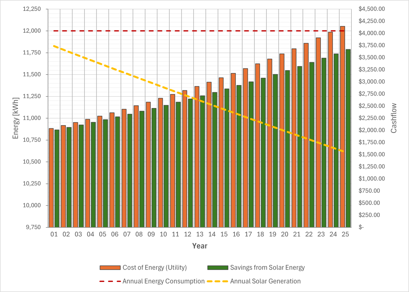 - Utility Cost Savings: Starting at an average rate of 17 cents per kWh with an annual increase of 3%, projected savings over 25 years total approximately $33,658.