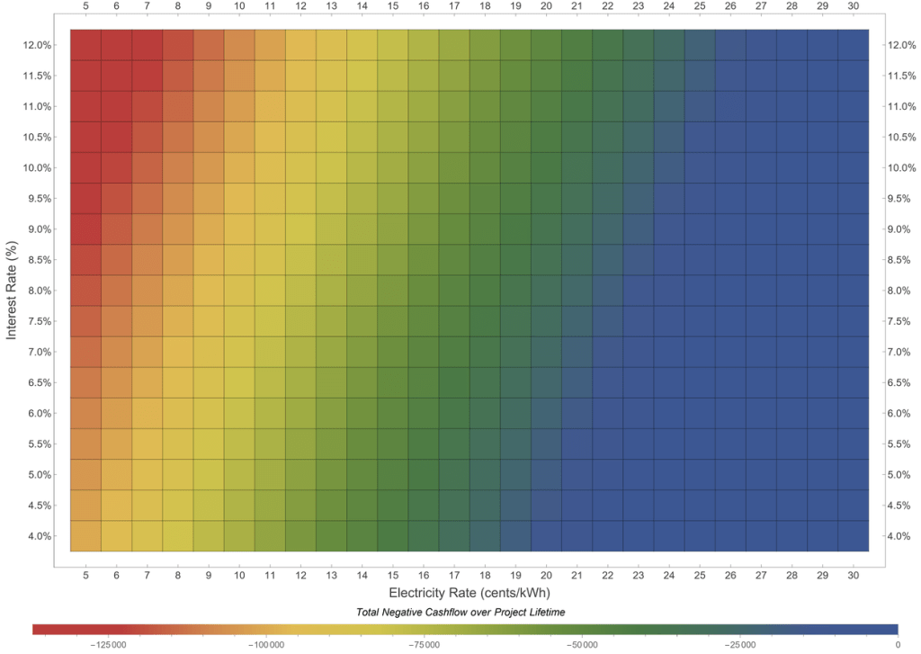 If we allow ourselves to tweak just two variables – the electricity rate you’re offsetting and the interest rate on your loan – we can analyze the conditions under which the project maintains positive cash flow every single year. While you don’t fully control either variable, understanding their impact helps identify which states, markets, and financing environments are inherently more attractive.