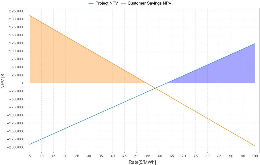 When plotting customer savings NPV and project NPV across a range of PPA prices, an important pattern emerges. There are price levels where the customer is guaranteed positive savings, specifically whenever the PPA price is below the credit rate. There are also price levels where the developer would generate a positive project NPV, generally when the PPA price rises above the credit rate.