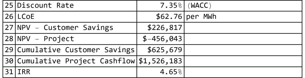 This is ultimately why the project does not work. The structure successfully delivers customer savings and protects the utility, but it does so at the expense of the developer’s economics. Without a viable return for the party building and operating the asset, the project cannot move forward in practice.
