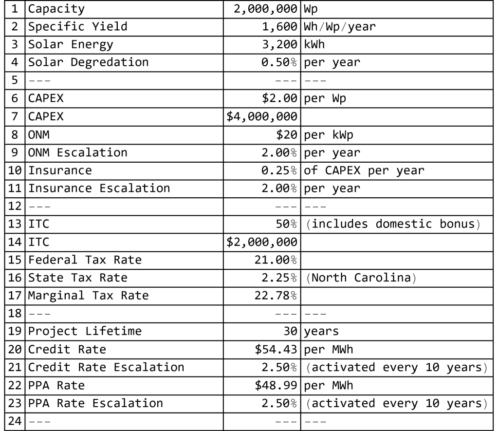 Second, the model assumes a total Investment Tax Credit of 50 percent. This includes the base ITC, the domestic content adder, and the energy community bonus. In practice, this assumption is not particularly aggressive. Domestic modules are currently available at a modest premium, often on the order of twenty to thirty cents per watt, which makes qualifying for the additional ten percent ITC relatively achievable. Site selection within an eligible energy community further supports this assumption.